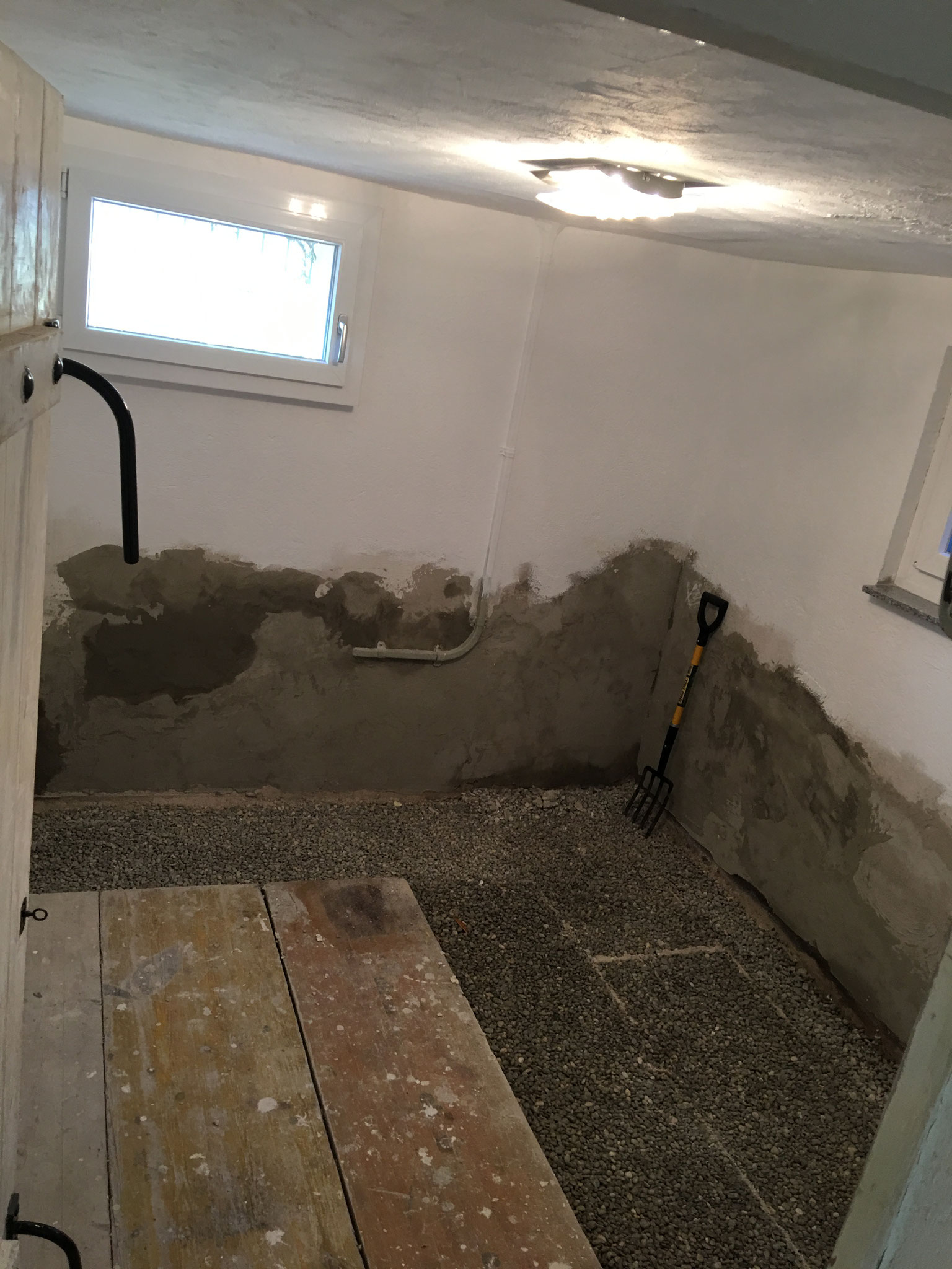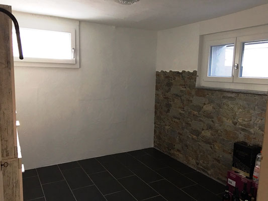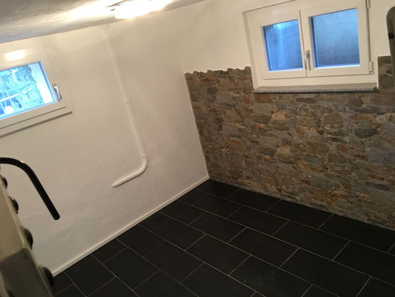So ist es und bleibt es sauber. Mit dem Stein-Look an der Wand beleibt das Naturkeller-Feeling trotz moderner Renovation erhalten
