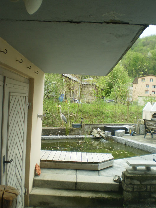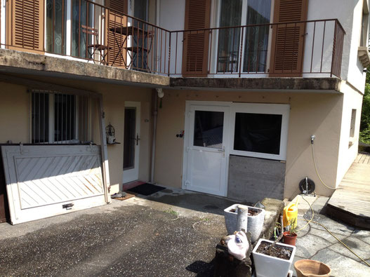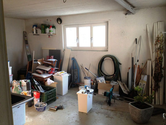 Zur Werkstatt / Atelier wurde die alte Garage, indem das für heutige Autos zu schmale Garagetor mit einer Nebeneingangstüre und einem grossen Fenster ersetzt wurde.